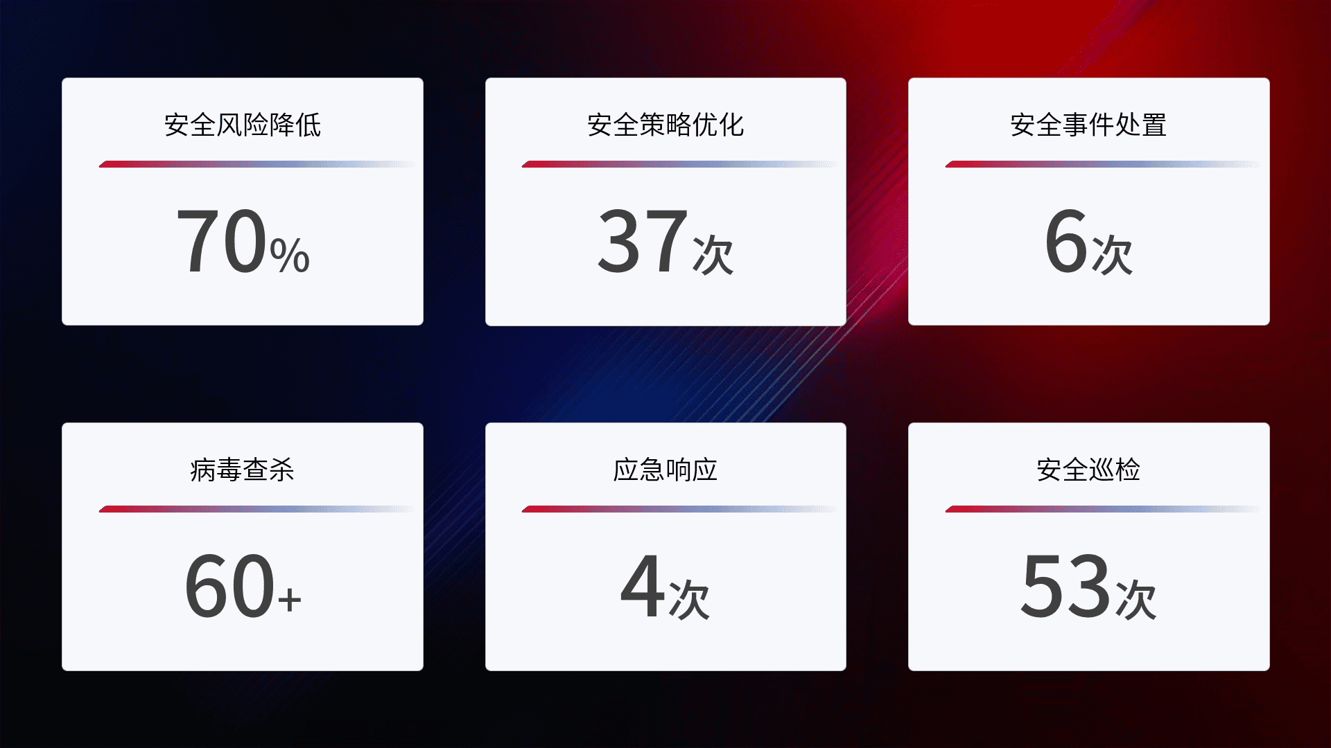提供全面的安全事件报告体系,,,包括处置报告、、、周报、、季度和年度总结,,,结合持续监控,,,,帮助客户深入了解网络安全状况。。