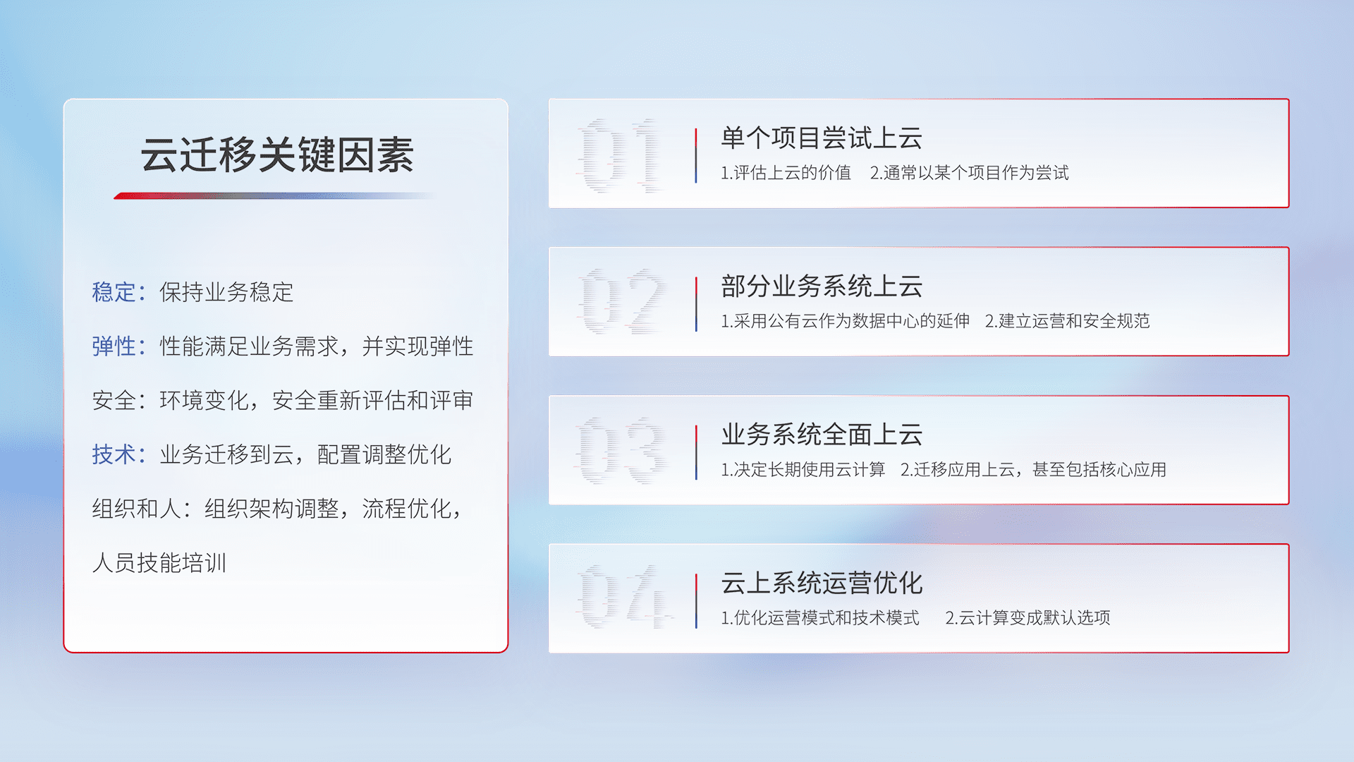 结合实际业务,,,,从规划设计、、云平台选型、、、云原生改造、、数据迁移、、、、集成交付,,,,迁移全过程为客户识别最佳上云路径,,做好风险识别管理,,,,设计网络架构、、身份权限、、、、安全审计合规、、操作审计、、日志审计、、、、监控告警策略、、、、多站点容灾设计等,,,,对云上基础设施进行整体规划,,,,提升IT治理水平,,以满足弹性、、、高可用、、高性能的需求。。