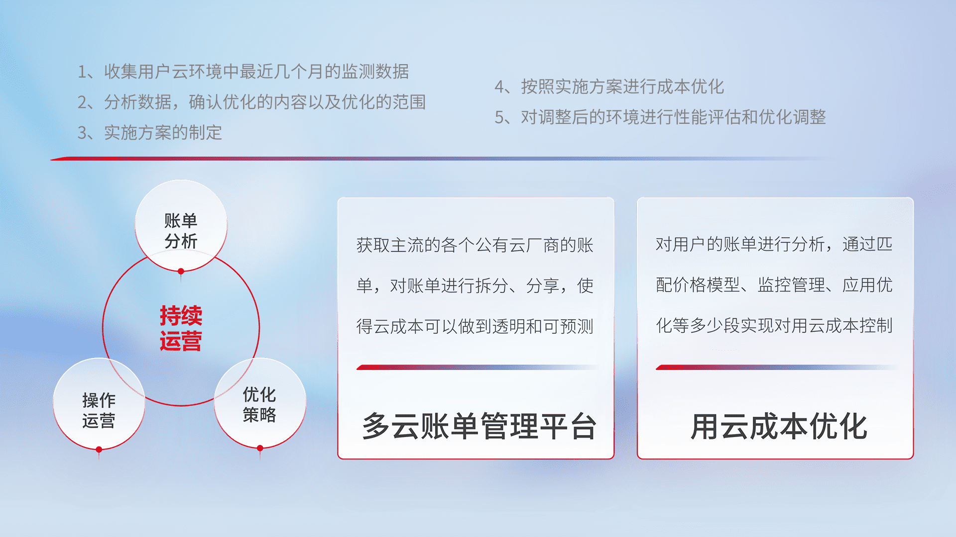 通过多云纳管,,,,以统一的资源数据模型把客户的云资源进行抽象和封装,,进而实现对多云资源的统一操作,,保障云资源管理的可靠性、、、、稳定性与可用性。。。。量身定制化运维内容,,,配置、、开发运维、、、补丁管理、、备份、、监控、、、认证和访问管理、、、、审计和日常巡检等,,,,保障在用云过程中的可靠度,,,稳定度以及高可用率。。